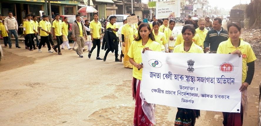 Holding placards scores of students rallied through Duliajan Township on Friday to spread the message related to protection of girl child and mother-child health etc. The rally was a part of health awareness campaign organized by Directorate of Field Publicity, Ministry of Information and Broadcasting, Dibrugarh with a view to make people aware about health schemes run by government.
