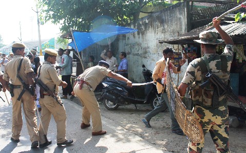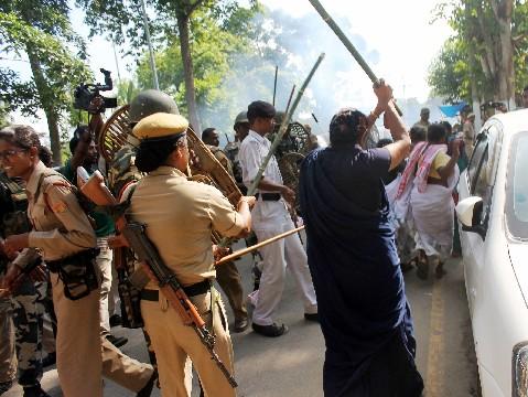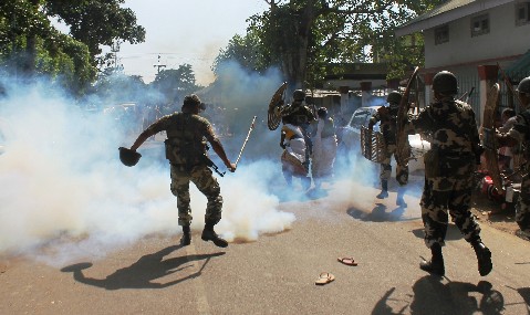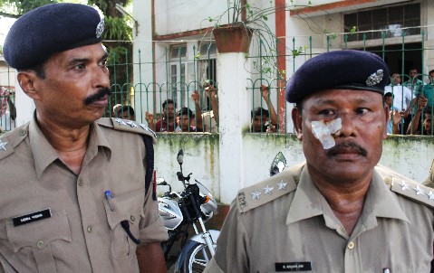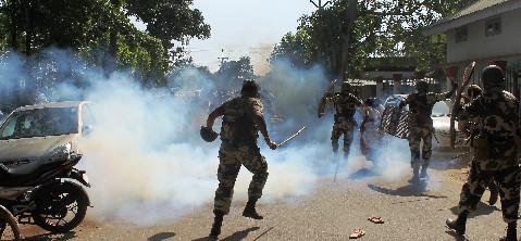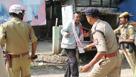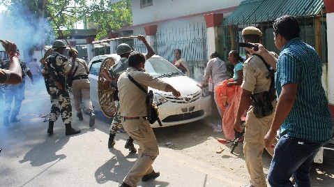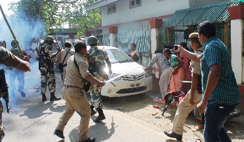 Initially the demonstration was going on peacefully and a five member delegation of the agitators’ also had a discussion with the Deputy Commissioner Julie Sonowal in her chamber. But when the demonstrators came to know that the negotiations have failed, they gave an ultimatum of 5 minutes to the Deputy Commissioner to come out of her office or they would crash the barricade. After the time limit the agitators turned violent started pelting stones and bottles at police and CRPF personnel. One such bottle hit the Deputy Superintendent of Police Budheswar Khaklari injuring him in his right eye and after that police resort to lathi charge to disperse the mob. To control the situation, police also burst teargas shells.