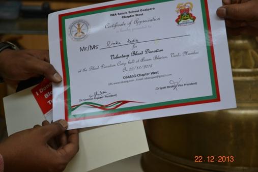The alumnus of Sainik School Goalpara residing in Mumbai and Pune also known as Old Boys Association, Sainik School Goalpara - Chapter West (OBASSG WC), in collaboration of Bombay Hospital, had organized a blood donation camp at Assam Bhavan, Mumbai on 22nd Dec 2013. This Blood donation camp was organized for the benefit of the Cancer patients of Assam who travel to Mumbai for treatment. The alumnus of school in their recently held annual get-together cum AGM on November has decided to work towards helping the cancer patients of Assam who come to Mumbai for treatment. As a first step; this Blood donation camp was organized where the alumnus as well as few local residents donated blood. As part of the collaboration with Bombay Hospital, the association (OBASSG WC) would be entitled to get blood for the needy cancer patients for next two years from the blood bank. Dr. Jyoti Prasad Medhi- an alumni of the school-who is a cancer surgeon at Bombay Hospital, Mumbai would be the contact person for the helping the patients in this regards.
