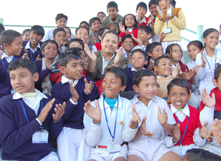 Children enjoying some light moments with populer singer-music director Manas Robin during the 12th biennial conference of All Assam Moina Parijat, the biggest childrens' body of Assam at Sivasagar on 04-02-2008.